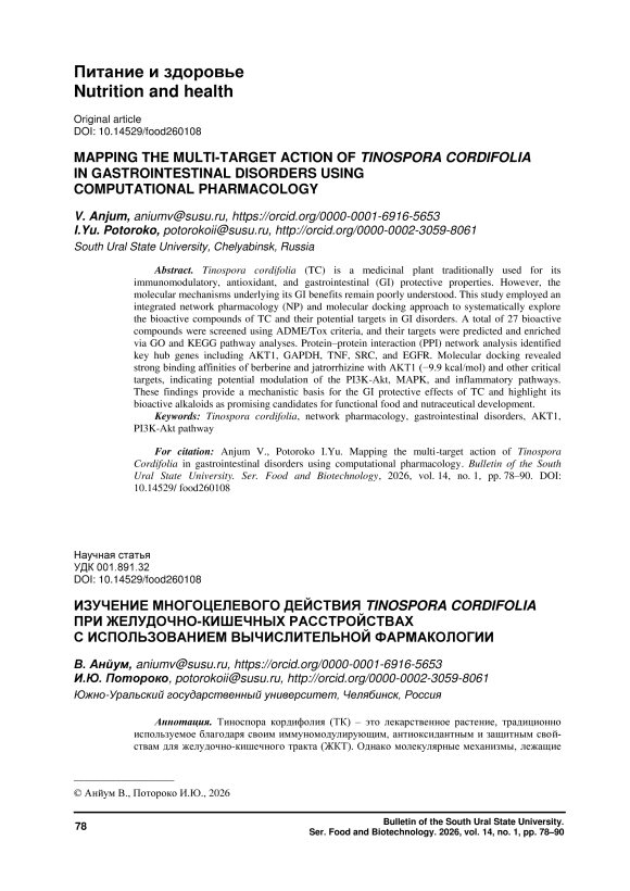 Тиноспора кордифолия (ТК) – это лекарственное растение, традиционно используемое благодаря своим иммуномодулирующим, антиоксидантным и защитным свойствам для желудочнокишечного тракта (ЖКТ). Однако молекулярные механизмы, лежащие в основе ее пользы для ЖКТ, остаются недостаточно изученными. В данном исследовании был применен интегрированный подход сетевой фармакологии (NP) и молекулярного докинга для систематического изучения биоактивных соединений TК и их потенциальных мишеней при заболеваниях ЖКТ. Всего было протестировано 27 биоактивных соединений с использованием критериев ADME/Tox, а их мишени были предсказаны и обогащены с помощью анализа GO и KEGGпутей. Анализ сети белковобелковых взаимодействий (PPI) выявил ключевые геныхабы, включая AKT1, GAPDH, TNF, SRC и EGFR. Молекулярный докинг показал сильное сродство связывания берберина и ятрорризина с AKT1 (−9,9 ккал/моль) и другими критическими мишенями, что указывает на потенциальную модуляцию PI3KAkt, MAPK и воспалительных путей. Эти результаты обеспечивают механистическую основу для защитного действия ТК на желудочнокишечный тракт и подчеркивают перспективность его биоактивных алкалоидов в качестве кандидатов для разработки функциональных продуктов питания и нутрицевтиков.