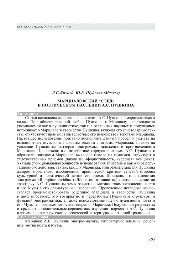 Статья посвящена выявлению в наследии А.С. Пушкина «марциаловского кода». При общепризнанной любви Пушкина к Марциалу, неоднократно упоминаемой как в пушкинистике, так и в различных научных и популярных источниках о Марциале, в творчестве Пушкина, включая его эпистолярные тексты, отсутствуют прямые свидетельства о его знакомстве с текстами Марциала. Настоящее исследование призвано восполнить данный пробел и указать на имплицитные отсылки к знаковым текстам эпиграмм Марциала, а также на усвоение Пушкиным паттерна эпиграммы, заложенного произведениями Марциала. Прослежено взаимодействие корпуса эпиграмм А.С. Пушкина с образцами эпиграмм Марциала, выявлена гомология тематики, структуры и художественных приемов (лаконизм, афористичность, «ударная» концовка). Указана функциональная общность использования эпиграммы как жанра репутационного действия: так же, как для Марциала, эпиграмма стала для Пушкина жанром морального изобличения, иронической критики теневой стороны культурной и политической жизни его эпохи. Доказано, что знаменитая эпиграмма «Rumpitur invidia» («Лопается от зависти») оказала влияние на трактовку А.С. Пушкиным темы зависти и мотива взаимоотношений поэта и его Музы в его драматургии и лироэпике. Проведенное исследование позволяет продемонстрировать рецепцию Марциала в творчестве Пушкина в двух ипостасях: это восприятие и переработка Пушкиным структуры и функций эпиграмматики, а также использование идеи о дуальности поэта и его Музы из программного стихотворения Марциала. Полученные результаты открывают дополнительные перспективы изучения творчества А.С. Пушкина и взаимодействия русской классической литературы с античной традицией.