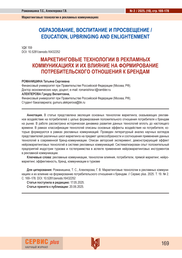 В статье представлена эволюция основных технологии маркетинга, оказывающих рекламное воздействие на потребителей с целью формирования положительного отношения потребителя к брендам на рынке. В работе рассмотрена историческая динамика развития данных технологий вплоть до настоящего времени. В рамках классификации технологий описаны основные эффекты воздействия на потребителя, которые формируются в рамках рекламных коммуникаций. Проведен литературный анализ научных взглядов представителей различных школ маркетинга на предмет целесообразности и соотношения применения данных технологий в современной бренд-коммуникации. Описан авторский эксперимент, демонстрирующий эффект нейромаркетинговых технологий в системе рекламных коммуникаций. Систематизирован опыт положительный предприятий индустрии туризма и гостеприимства в аспекте применения нейромаркетинговых инструментов в рекламной коммуникации.