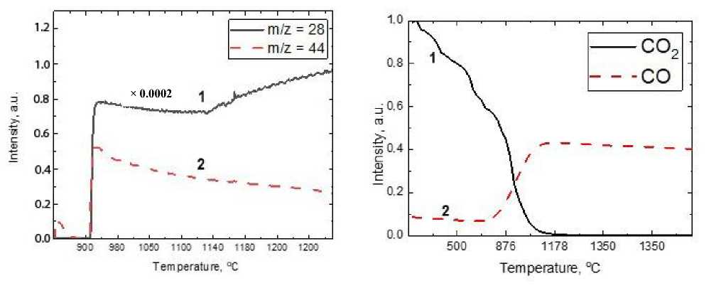 Однако разделить вклады, обусловленные CO 2 и SiO, в общий сигнал молекул с массовым числом m/z = 44 и определить их парциальные давления исключительно методами масс-спектрометрии представляет собой сложную задачу. Наблюдаемый незначительный пик при малых температурах синтеза однозначно можно определить как выход газа CO 2 из стенок графита. Однако уже при достижении температуры 900 °C сигнал уменьшается до нулевых значений. Далее следует резкое повышение сигнала непосредственно с подачей СО.
