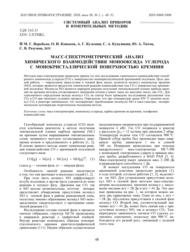 Методом масс-спектрометрии проведено прямое (in situ) исследование химического взаимодействия газообразного монооксида углерода (CO) с поверхностью монокристаллической кремниевой подложки. Цель данной работы — определение присутствия в газовой фазе малых количеств молекул монооксида кремния (SiO), которые являются продуктом химической реакции взаимодействия газа CO с поверхностью кремниевой подложки. Молекула SiO является маркером реакции получения эпитаксиальной пленки карбида кремния на кремнии методом согласованного замещения атомов и имеет такое же массовое число, как CO2. Для однозначного определения вклада молекул CO2 на спектр было проведено исследование разложения газа CO2 в CO при типичных условиях процесса. Определено, что при температурах выше 950 °C наличие молекул CO2 в реакторе минимально, что подтверждает преобладание молекулы SiO в масс-спектрах, экспериментально подтверждая теоретические положения метода.