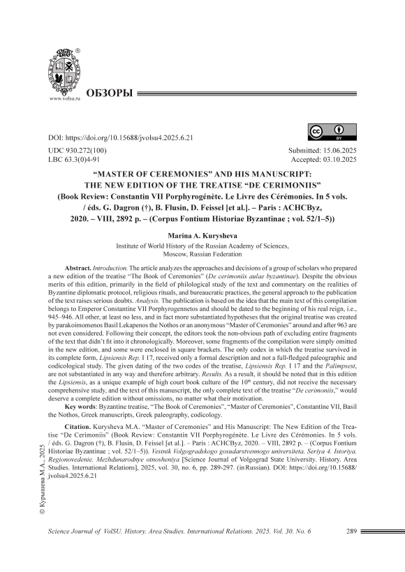 В статье анализируются подходы и решения группы исследователей, подготовивших новое издание трактата «О церемониях византийского двора» (De cerimoniis aulae byzantinae). Несмотря на вполне очевидные достоинства этого издания, прежде всего в области филологического исследования текста и комментирования реалий византийского дипломатического протокола, религиозных ритуалов и бюрократических практик, общий подход к изданию текста вызывает серьезные сомнения. В основу издания положена идея о том, что основной текст данной компиляции принадлежит императору Константину Багрянородному и должен датироваться началом его реального правления, то есть 945–946 годами. Все остальные, как минимум, не менее, а на самом деле более обоснованные гипотезы, о том, что оригинал трактата создавался паракимоменом Василием Лакапином Нофом или анонимным «мастером церемоний» после 963 г. даже не рассматриваются. Следуя своей концепции, издатели пошли по неочевидному пути исключения целых фрагментов текста, которые хронологически не вписывались в нее. Причем часть фрагментов компиляции была просто опущена в новом издании, а часть заключена в квадратные скобки. Единственный кодекс, в котором трактат дошел в полном виде, Lipsiensis Rep. I 17 получил лишь формальное описание, а не полноценное палеографическое и кодикологическое исследование. Приведенные датировки двух кодексов трактата, Lipsiensis Rep. I 17 и палимпсеста, никак не обоснованы, а значит произвольны. В итоге следует констатировать, что в данном издании кодекс Lipsiensis как уникальный образец высокой придворной книжной культуры X столетия не получил необходимого комплексного исследования, а текст этой рукописи, единственного полного списка трактата «О церемониях», заслуживал бы полного издания без пропусков, чем бы они не были мотивированы.