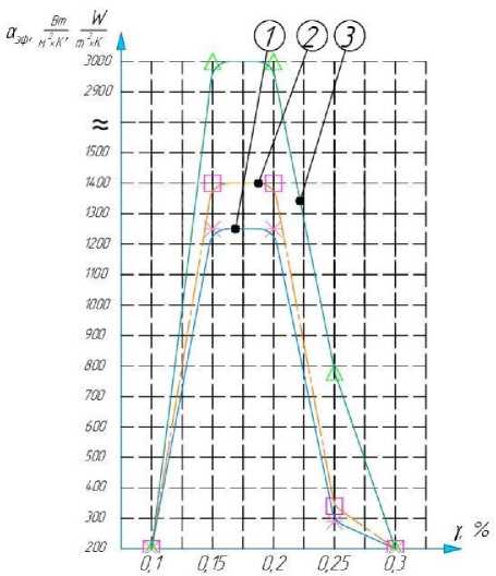 Figure 7. The dependence of the heat transfer coefficient on the readings of the degree of filling of the drying chamber, at different readings of the temperature of the drying agent; 1 – 10%, 2 – 20%, 3 – 30%, at n = 1.5 rpm, T = 403 K
