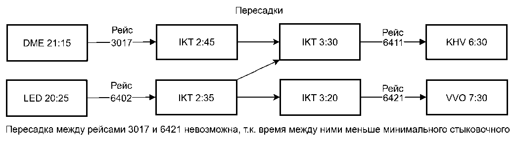 Для моделирования стыковок между рейсами в граф добавляются пересадочные ребра. Они соединяют рейсы в хабовых аэропортах, если разница между временем прибытия одного и временем отправления второго лежит между минимальным и максимальным допустимым временем стыковки. На рисунке 2 приведены пересадочные ребра и рейсы, которые они соединяют.