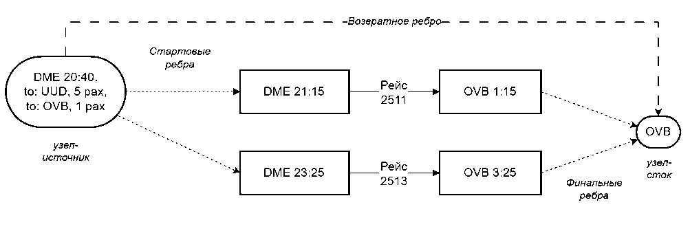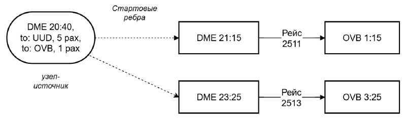 Пример соединения узла-источника с рейсовыми ребрами с помощью стартовых ребер приведен на рис. 3.