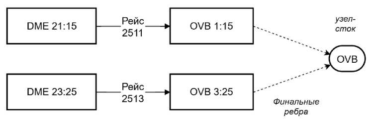 Пример соединения узла-стока с рейсовыми ребрами с помощью финальных ребер приведен на рис. 4.