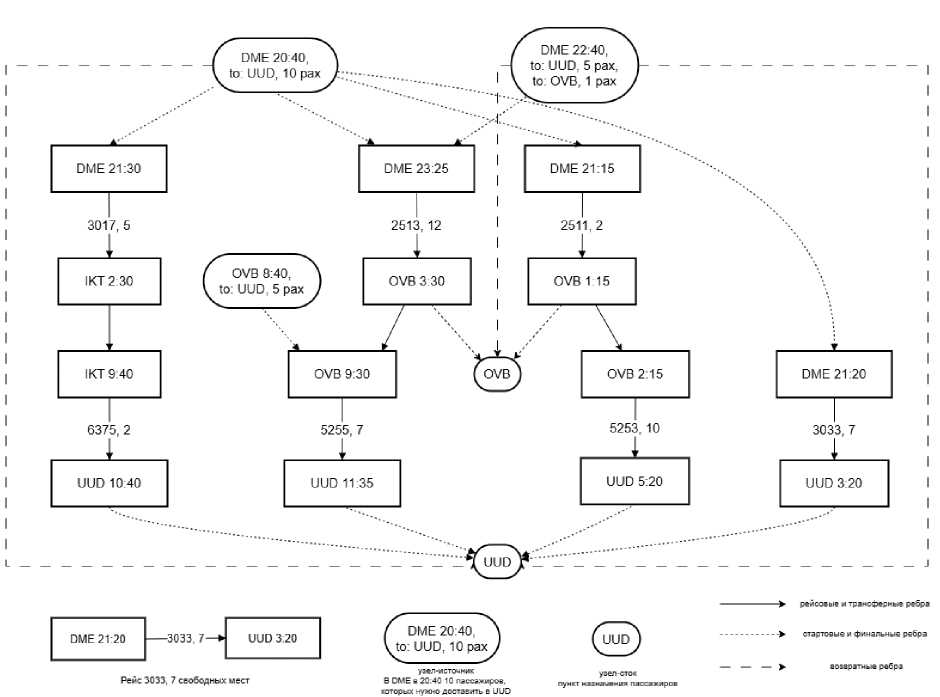 4.2. Шаг 2. Построение маршрутов пассажиров На первом шаге было получено распределение пассажиров по рейсам: определено количество пассажиров из каждой группы на каждом рейсе. Этот результат может быть сложен в применении. Практическую ценность имеет явный маршрут перевозки для каждого пассажира. Он представляет собой последовательность рейсов, пролет по которым приведет пассажира в пункт назначения. От потока как оптимального размера перевозки по каждому ребру нам нужно перейти к потоку как пути или линейной комбинации путей от источника к стоку. Такой переход всегда возможен [15, с. 18-20], опишем его. Для каждой группы пассажиров выполняются следующие действия: 1) Строится подграф графа сбойной ситуации для данной группы пассажиров. В него включаются только ребра, по которым происходит перевозка пассажиров из рассматриваемой группы. Объем перевозки по ребру также отражает только перевозку пассажиров данной группы. Ребра и объемы перевозки по ним были получены на первом шаге алгоритма. 2) Определяются источники и стоки в подграфе; 3) Для каждой пары источник-сток выполняется поиск всех возможных простых путей (проходящих через каждую вершину не более одного раза); 1. Для каждого найденного пути вычисляется минимальная пропускная способность среди всех составляющих его рёбер. Она определяет максимально возможный объём перевозки по данному пути; 2. Если минимальная пропускная способность пути положительна, то этот путь добавляется в ответ, и уменьшается пропускная способность всех рёбер на этом пути на величину сформированного потока; 3. Выполняется переход к следующему простому пути данной пары источник-сток; 4) Выполняется переход к следующей паре источник-сток. 5. Вычислительные примеры в различных сценариях сбойных ситуаций Рассмотрим пример расчета новых маршрутов для пассажиров. Пусть задерживаются на прилет два рейса в Москву и один в Новосибирск. Из-за этого срываются стыковки у нескольких пассажиров, следующих в разные города — Улан-Удэ и Новосибирск. Данные о них см. в табл. 1. На момент расчета известно ожидаемое время прибытия в аэропорт срыва стыковки. Определим, на какие рейсы требуется пересадить пассажиров для кратчайшей доставки в пункт назначения. В таблице 2 приведено расписание рейсов авиакомпании и число свободных мест на каждом. Для наглядности указаны рейсы только между рассматриваемыми городами, учитывая возможность пролета через другие хабы. При этом в общем случае рассматривается возможность перевозки по всем рейсам авиакомпании. Построим граф сбойной ситуации, следуя описанному выше алгоритму. Отобразим рейсы и возможные пересадки между ними. Пассажиров с сорванными стыковками представим в виде узлов-источников, конечные пункты назначения — в виде узлов-стоков. От источников построим стартовые ребра к узлам-началам рейсов, от узлов-окончаний рейсов построим финальные ребра к стокам. От источников к стокам проведем возвратные ребра, которые отражают невозможность перевозки пассажиров и возврат билета. Таким образом, получаем транспортную сеть, в которой требуется найти поток минимальной стоимости. Она изображена на рис. 7. Рис. 7. Граф сбойной ситуации Таблица! Группы пассажиров с сорванной стыковкой Аэропорт срыва стыковки Аэропорт назначения Время прибытия в аэропорт срыва Количество п