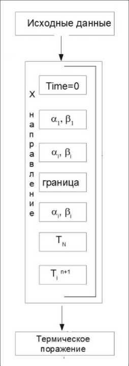 соответствии с алгоритмом входные данные, необходимые для работы вычислительной процедуры, реализованной на языке программирования высокого уровня. Затем процесс расчета проходит несколько последовательных этапов. В структуре алгоритма три блока. Первый блок отвечает за расчет поля температур в рассматриваемой системе. Для решения одномерных уравнений использовался метод конечных разностей [13–15]. Для решения разностных аналогов уравнений в частных производных параболического типа используется метод прогонки [14]. В прямом ходе инициализируются прогоночные коэффициенты, а в обратном ходе вычисляется температура в тканях человека на следующем временном слое. Следует отметить, что для определения прогоночных коэффициентов на границах раздела сред с разными теплофизическими характеристиками используются граничные условия четвертого рода. Второй блок позволяет определить факт формирования зоны термического поражения. Для этого используется экспериментальная информация о том, что гибель белка наблюдается при 42 °C [3, 12]. Третий блок позволяет определить степень термического поражения.