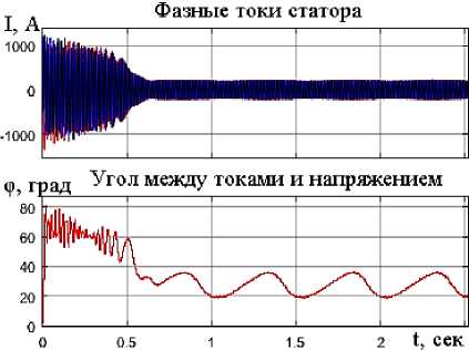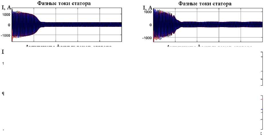 На рис. 2а приведены результаты математического моделирования работы асинхронного электродвигателя мощностью 1700 кВт, используемого в качестве привода циркуляционного насоса на электростанциях с блоками мощностью 200 МВт при исправной обмотке ротора, а на рис. 2b – при обрыве трех стержней.