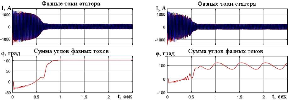 На рис. 4а и 4b приведены результаты моделирования предложенного диагностирующего признака обрыва стержней по углу между фазными токами статора и питающим напряжением при исправной короткозамкнутой обмотке и при одном оборванном стержне короткозамкнутого ротора соответственно.