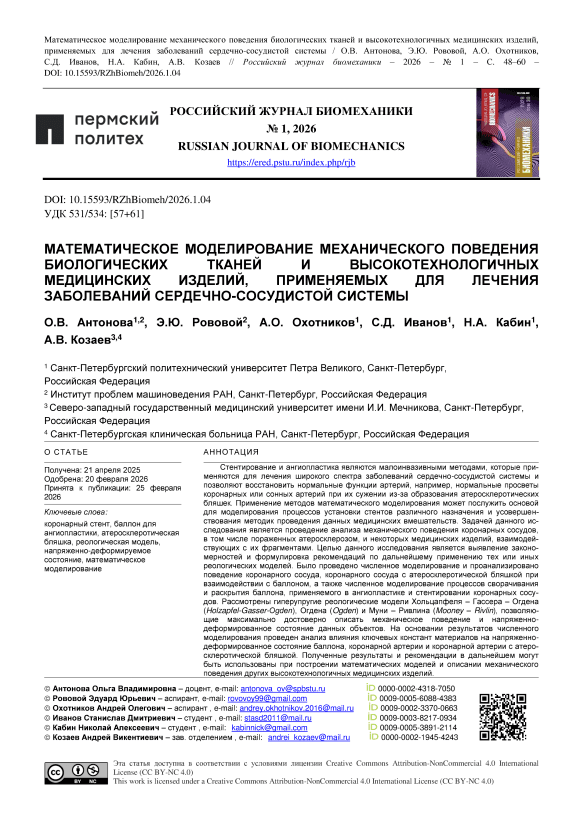 Стентирование и ангиопластика являются малоинвазивными методами, которые применяются для лечения широкого спектра заболеваний сердечнососудистой системы и позволяют восстановить нормальные функции артерий, например, нормальные просветы коронарных или сонных артерий при их сужении изза образования атеросклеротических бляшек. Применение методов математического моделирования может послужить основой для моделирования процессов установки стентов различного назначения и усовершенствования методик проведения данных медицинских вмешательств. Задачей данного исследования является проведение анализа механического поведения коронарных сосудов, в том числе пораженных атеросклерозом, и некоторых медицинских изделий, взаимодействующих с их фрагментами. Целью данного исследования является выявление закономерностей и формулировка рекомендаций по дальнейшему применению тех или иных реологических моделей. Было проведено численное моделирование и проанализировано поведение коронарного сосуда, коронарного сосуда с атеросклеротической бляшкой при взаимодействии с баллоном, а также численное моделирование процессов сворачивания и раскрытия баллона, применяемого в ангиопластике и стентировании коронарных сосудов. Рассмотрены гиперупругие реологические модели Хольцапфеля – Гассера – Огдена (HolzapfelGasserОgden), Огдена (Ogden) и Муни – Ривлина (Mooney – Rivlin), позволяющие максимально достоверно описать механическое поведение и напряженнодеформированное состояние данных объектов. На основании результатов численного моделирования проведен анализ влияния ключевых констант материалов на напряженнодеформированное состояние баллона, коронарной артерии и коронарной артерии с атеросклеротической бляшкой. Полученные результаты и рекомендации в дальнейшем могут быть использованы при построении математических моделей и описании механического поведения других высокотехнологичных медицинских изделий.