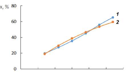 Рисунок 2. Зависимости изменения конверсии (x) от времени синтеза (τ) каучука ДССК-2560Ф: 1 – эксперимент; 2 – расчет