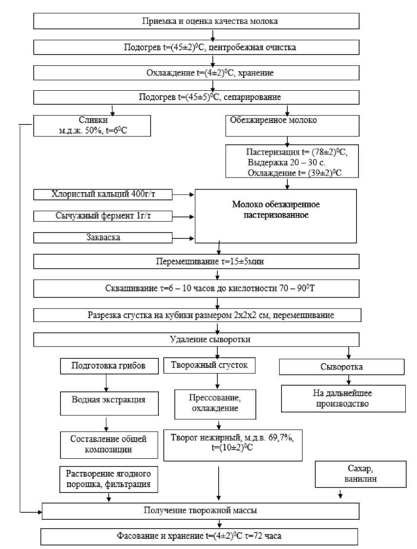 Творожная масса — молочный или молочный составной продукт из творога с возможным добавлением сливочного масла, сливок, сгущённого молока с сахаром, сахаров и/или соли, а также с возможным добавлением немолочных компонентов не в целях замены составных частей молока. [5]. Этому уникальному по своему составу продукту чаще всего можно добавить функциональность. Введение немолочных растительных компонентов и являются обогатителями. Особую актуальность в связи с этим приобретает разработка и внедрение в производство экологически безопасных, полноценных по составу продуктов питания, обладающих высокой пищевой и биологической ценностью. Сырьем для обогащенных продуктов питания могут являться пищевые лесные ресурсы, к которым согласно ст. 34 Лесного кодекса РФ относятся дикорастущие грибы, ягоды и лекарственные растения.