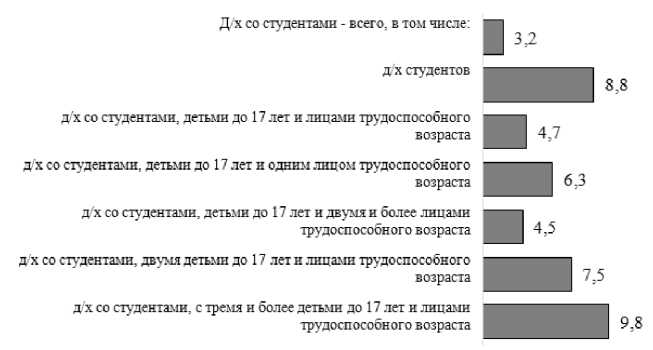 Риски бедности домохозяйств со студентами более чем в 3 раза выше, чем риски бедности домохозяйств в целом (рисунок 3). Причём наиболее высокие риски бедности наблюдаются среди домохозяйств студентов (в 8,8 раза выше среднего) и домохозяйств со студентами, имеющими в своем составе трёх и более детей до 17 лет (в 9,8 раза выше среднего).
