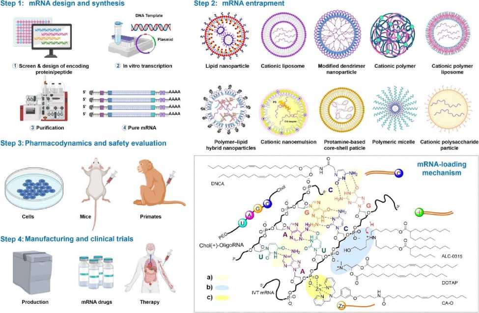 Разработка терапевтических средств на основе мРНК в основном включает в себя дизайн мРНК, синтез, захват мРНК, фармакодинамику, фармакокинетику, оценку безопасности in vivo и in vitro , производство и клинические испытания (Рис. 1). Дизайн и синтез мРНК представляют собой ключевые этапы в процессе создания лекарственных препаратов на основе мРНК. мРНК имеет пять функциональных областей, включая 5′-кэп, 3′ поли(А) хвост, открытую рамку считывания (ОРС) фланкирования и 3′ нетранслируемые области (НТО), элементы которых опосредуют эффективность трансляции и скорость распада мРНК [15]. Примечательно, что получение высоко биологически активной РНК обычно зависит от надежного дизайна и подготовки [16].