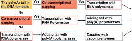 IVT мРНК выполняется с линеаризованными плазмидными ДНК-шаблонами или ПЦР-шаблонами, требующими, по крайней мере, промотора и соответствующей последовательности конструкции мРНК. IVT мРНК выполняется путем добавления полимераз (T7, T3 или SP6), но требует дополнительного кэпирования [57]. Некэпированная мРНК быстро разрушается РНКазой и содержит группу 5‘-ppp, которая вызывает большую иммунную стимуляцию и может быть обработана фосфатазой для снижения нежелательной эффективности [58]. Для кэпирования IVT мРНК применяются два метода: котранскрипционное кэпирование и посттранскрипционное кэпирование [58]. Кэпированные динуклеотидные смеси, содержащие четыре других нуклеозидтрифосфата (NTP), включаются в 5‘-конец РНК с РНК-полимеразой во время котранскрипционного кэпирования [59]. Описан метод без использования метки для идентификации 5'-концевого кэпа и ориентации мРНК [60]. Котранскрипционный кэппинг-процессинг позволил координировать транскрипцию с кэпированием мРНК, но его недостатками являются конкурентное включение нуклеозидов ГТФ, что снижает эффективность кэпирования [61].