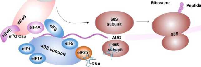 Инициация трансляции эукариотических мРНК — это сложный и тщательно контролируемый процесс. Он включает в себя сборку комплекса из нескольких белков и РНК, который направляет рибосомы к стартовому кодону [19]. Как правило, кэп-зависимая трансляция начинается с распознавания кэпа эукариотическим фактором инициации 4F (eIF4F) и сборки преинициациаторного комплекса (PIC), который состоит из тернарного комплекса, 40S рибосомальной субъединицы, eIF1, eIF1A, eIF3 и eIF5 [20]. eIF4F состоит из eIF4A, eIF4E и eIF4G, которые способствуют рекрутированию PIC за счет взаимодействия eIF4E-cap и eIF4G-eIF3. eIF4F обеспечивает циркуляцию мРНК, взаимодействуя с 5‘-кэпом через eIF4E и PABP, который связывается с поли(А)-хвостом [21]. 40S рибосома сканирует 5'-UTR и распознает кодон инициации с помощью eIF4A для разворачивания вторичной структуры 5'-UTR, затем 40S рибосомальная субъединица сканирует кодон инициации транскрипции, рекрутируются 60S рибосомальные субъединицы, и освобождаются eIFs для начала удлинения аминокислотной цепи [22]. Затем мРНК декодируется в рибосоме для производства определенной аминокислотной. Существует баланс между процессами трансляции и распада мРНК (Рис. 3) [23]. Ранее было установлено, что структурные элементы, которые активно транслируются, также тесно связаны с распадом мРНК, особенно 5'-кэп и поли(А)-хвост [24]. 5'-кэп защищает мРНК от 5'-3' экзорибонуклеаз, а длина поли(А)-хвоста определяет 3‘-5' экзонуклеолитический распад [25]. Учитывая значимость этих функциональных элементов, многие исследования были направлены на оптимизацию структуры мРНК. Например, были разработаны различные аналоги 5‘-кэпа, изменены длины поли(А)-хвостов, выявлены уникальные участки в UTR и кодированы разнообразные функциональные пептиды или механизмы вирусной репликации в OPCs [26].