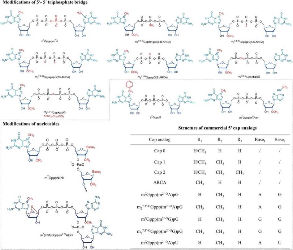 Химические модификации мРНК, направляющих РНК CRISPR-Cas и аптамера мРНК IVT представляет собой оцРНК, содержащую 5'-кэп-структуру, ОРС, фланкирующие 5'- и 3'-UTR и 3'-поли(А)-хвост. Оптимизация мРНК-вакцин часто начинается с этих пяти структур посредством оптимизации последовательности, нуклеозидной модификации или замены последовательности UTR для усиления трансляционной способности РНК [70]. Различные химические модификации нуклеозидов, включая псевдоуридин (Т), Nl-метилпсевдуридин (т1Т), 5-метилцитидин (m5C), 5-гидроксиметилцитозин (5hmC), 5-метилуридин (m5U) и 2-тиоуридин (s2U), были введены в мРНК для минимизации врожденного иммунного ответа, запускаемого IVT мРНК [71].