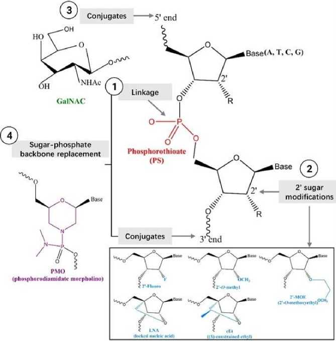 Подобно АСО и миРНК, разнообразные химические модификации и конъюгации могут усиливать фармакокинетические характеристики РНК-аптамеров (рис. 5) [56]. Большинство аптамеров в клинических испытаниях химически модифицируются с использованием 5'-концевого ПЭГилирования (для сопротивления почечного клиренса), стратегии кэпирования З'-конца инвертированным тимидином и 2'-замен в сахарном кольце (для предотвращения деградации нуклеаз) [77]. Модификация связи PS также может оптимизировать свойства аптамеров за счет улучшения аффинности связывания с мишенью [78].