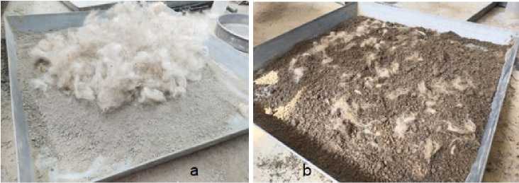 Sheep wool fiber (SWF): Sheep wool is multicellular materials composed of three main structural parts of medulla, cortex, and epidermis, which consist of mixture of soft, intermediate and coarse hair. Because of its physicochemical characteristics, it can be utilized as a reinforcing component in composites materials [24]. Compressed stabilized earth bricks, reinforced with fiber, present better flexural tensile strength, higher compressive strength, and improved cracks and crack diffusion resistance, depending on fiber types and soil [25]. Sheep wool's unique physicochemical properties make it suitable for use in composite materials, which supports bioeconomy and sustainable development efforts. [26]. Aymerich et al. [27] studied earthen specimen’s flexural strength, and they used 2-3% and 2-3 cm lengths of sheep wool fibers. The authors found that the fibers improved the material's residual strength, ductility, and energy absorption following the initial cracking.