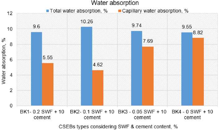 Water absorption . The results (Fig. 10) show that the addition of SWF has a considerable effect on total water absorption. As SWF content increases, water absorption also increases. However, it should be noted that bulk density also influences water absorption: bricks with higher dry bulk density exhibit lower water absorption due to fewer voids in the matrix. Specimen BK1 has more SWF content and a higher dry bulk density (2106 kg/m³) than that of the other BK2 = BK3 = 2074 kg/m³ samples but has lower water absorption. Despite this, when comparing specimens BK2, BK3, and BK4 (2049 kg/m³), where BK4 has 0% SWF and lower dry bulk densities than the others, water absorption increases with the adding and increasing of SWF content. This indicates that, independent of minor variations in density, the total water absorption capacity of the bricks increases with the addition and increase of SWF caused voids due to inclusion of SWF. The average total water absorption (9.79%), with a standard deviation (SD) of 0.33% and a coefficient of variation (COV) of 3.37%, indicates good consistency and low variability in the material performance.