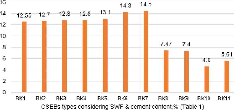 Overall, the results demonstrate that the water absorption rates of the prepared CSEBs specimens are significantly lower than the maximum allowable limits specified in [16], 20%, and [17], [32] [33], which mentioned 15%, established standards.