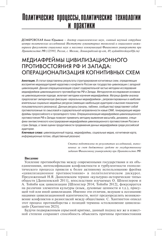 Медиафреймы цивилизационного противостояния РФ и Запада: операционализация когнитивных схем