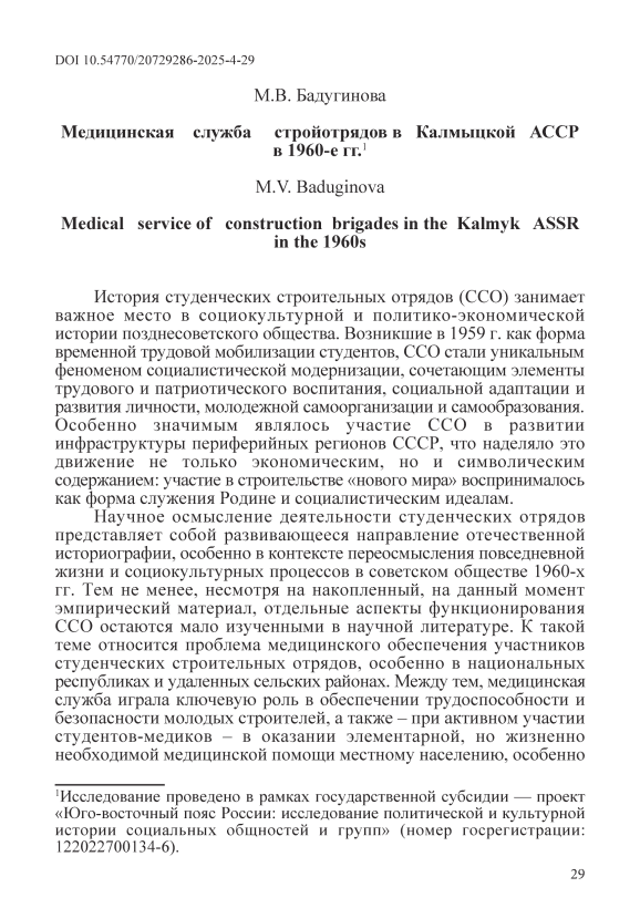 ССО, объединяя региональные, тематические и биографические подходы. Несмотря на накопленный корпус работ, освещающих хозяйственную, идеологическую и культурную функции ССО, вопросы медицинского обеспечения студенческих отрядов остаются практически не исследованными. Особенно это касается деятельности медицинской службы ССО, работавших в сельских районах Калмыцкой АССР в 1960-е гг., где наряду с обслуживанием бойцов отрядов велась и помощь местному населению. Настоящая работа восполняет существующий историографический пробел, предлагая первый опыт обращения к архивным материалам Министерства здравоохранения Калмыцкой АССР с целью реконструкции практик медицинского сопровождения студенческих строительных отрядов. Она позволяет расширить знания не только о медицинской инфраструктуре советского времени, но и о социальной истории Калмыкии как пограничного региона, где процессы социализации молодежи сочетались с элементами гуманитарной помощи и медицинского просвещения местного населения в рамках трудовой мобилизации.