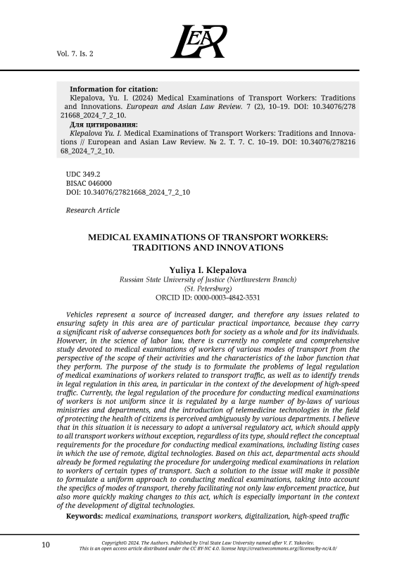 It should be noted that given the relevance of this issue, the science of labor law currently lacks a complete and comprehensive study dedicated to medical examinations of employees in various types of transport with regard to the sphere of their activities and the characteristics of the labor function they perform. Some studies in relation to aircraft staff, employees of roadway, railway, underground transport consider the issues of medical examinations, legal status of employees [Klepalova, 2007; Khizbullin, 2016; Panov, 2013; Grechukha, 2016]. Moreover, under the digitalization, the need for a single comprehensive study is in demand, as the procedure for conducting medical examinations is changing, they start to be conducted ‘remotely’, using hardware and software solutions [Chernyaeva, 2019; Shcherbakova, 2021].