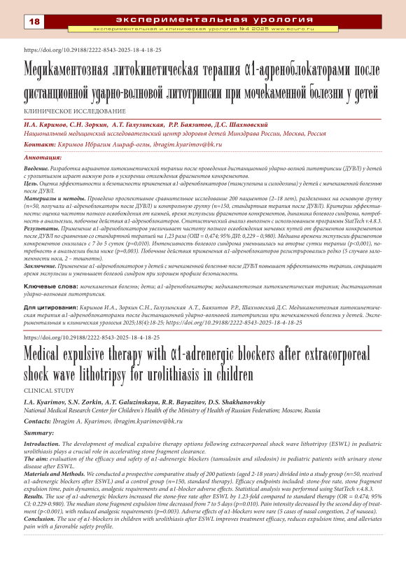 Введение. Разработка вариантов литокинетической терапии после проведения дистанционной ударно-волной литотрипсии (ДУВЛ) у детей с уролитиазом играет важную роль в ускорении отхождения фрагментов конкрементов. Цель. Oценка эффективности и безопасности применения α1-адреноблокаторов (тамсулозина и силодозина) у детей с мочекаменной болезнью после ДУВЛ. Материалы и методы. Проведено проспективное сравнительное исследование 200 пациентов (2–18 лет), разделенных на основную группу (n=50, получали α1-адреноблокаторы после ДУВЛ) и контрольную группу (n=150, стандартная терапия после ДУВЛ). Критерии эффективности: оценка частоты полного освобождения от камней, время экспульсии фрагментов конкрементов, динамика болевого синдрома, потребность в анальгезии, побочные действия α1-адреноблокаторов. Статистический анализ выполнен с использованием программы StatTech v.4.8.3. Результаты. Применение α1-адреноблокаторов увеличивает частоту полного освобождения мочевых путей от фрагментов конкрементов после ДУВЛ по сравнению со стандартной терапией на 1,23 раза (ОШ = 0,474; 95% ДИ: 0,229 – 0,980). Медиана времени экспульсии фрагментов конкрементов снизилась с 7 до 5 суток (p=0,010). Интенсивность болевого синдрома уменьшилась на вторые сутки терапии (p<0,001), потребность в анальгезии была ниже (p=0,003). Побочные действия применения α1-адреноблокаторов регистрировались редко (5 случаев заложенности носа, 2 – тошноты). Заключение. Применение α1-адреноблокаторов у детей с мочекаменной болезнью после ДУВЛ повышает эффективность терапии, сокращает время экспульсии и уменьшает болевой синдром при хорошем профиле безопасности.