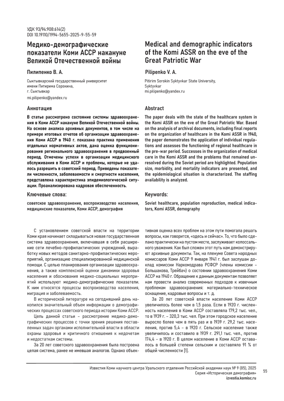 В статье рассмотрено состояние системы здравоохранения в Коми АССР накануне Великой Отечественной войны. На основе анализа архивных документов, в том числе на примере итоговых отчетов об организации здравоохранения Коми АССР в 1940 г. показана практика применения отдельных нормативных актов, дана оценка функционирования регионального здравоохранения в предвоенный период. Отмечены успехи в организации медицинского обслуживания в Коми АССР и проблемы, которые не удалось разрешить в советский период. Приведены показатели численности, заболеваемости и смертности населения, представлена характеристика эпидемиологической ситуации. Проанализирована кадровая обеспеченность.