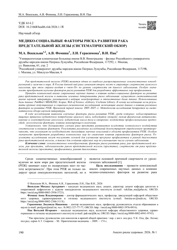 Рак предстательной железы (РПЖ) является одним из наиболее распространенных злокачественных новооб-разований у мужчин в мире. В России данный вид рака занимает второе место в структуре смертности мужского населения, при этом страна входит в «топ-10» по уровню смертности от данного заболевания. Особую значимость приобретает изучение факторов риска развития РПЖ для разработки эффективных мер профилактики. Проведен комплексный анализ современных научных данных о влиянии медико-социальных факторов на развитие рака предстательной железы и выявлены основные детерминанты риска заболевания: осуществлен систематический анализ научной литературы, размещенной в ведущих международных и отечественных базах данных. Использованные базы данных: PubMed / MEDLINE; Scopus; Web of Science; eLibrary; Cochrane Library. В основу исследования легли результаты крупных популяционных и социально-гигиенических исследований, включающих анализ данных о влиянии различных факторов на развитие РПЖ. Временной период поиска: 2005–2025 гг. Методология исследования базируется на систематическом обзоре научной литературы. В ходе исследования выявлены ключевые факторы риска развития РПЖ, среди которых: неблагоприятные пищевые привычки (избыточное потребление красного мяса, недостаток овощей); низкая физическая активность; курение и злоупотребление алкоголем; избыточная масса тела и ожирение; воздействие профессиональных вредностей; экологические факторы; влияние ионизирующего излучения. Установлено, что большинство случаев рака простаты развивается вследствие комплексного воздействия генетических и внешних факторов. Результаты различных исследований демонстрируют определенную противоречивость, что указывает на необходимость дальнейших научных изысканий в области профилактики РПЖ. Особую значимость приобретает разработка комплексных мер по снижению влияния управляемых факторов риска. Результаты исследования могут послужить основой для улучшения программ профилактики и ранней диагностики рака предстательной железы, а также для создания адресных мер по уменьшению числа случаев заболевания.