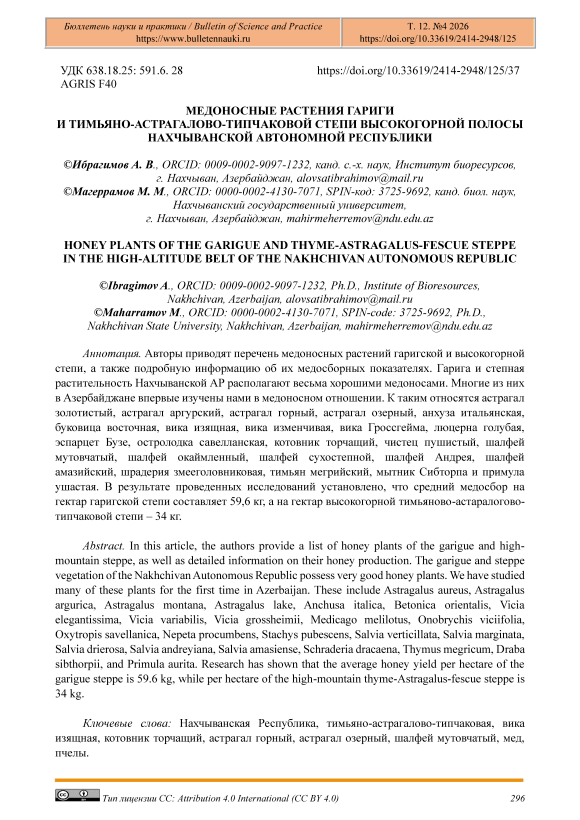 Авторы приводят перечень медоносных растений гаригской и высокогорной степи, а также подробную информацию об их медосборных показателях. Гарига и степная растительность Нахчыванской АР располагают весьма хорошими медоносами. Многие из них в Азербайджане впервые изучены нами в медоносном отношении. К таким относятся астрагал золотистый, астрагал аргурский, астрагал горный, астрагал озерный, анхуза итальянская, буковица восточная, вика изящная, вика изменчивая, вика Гроссгейма, люцерна голубая, эспарцет Бузе, остролодка савелланская, котовник торчащий, чистец пушистый, шалфей мутовчатый, шалфей окаймленный, шалфей сухостепной, шалфей Андрея, шалфей амазийский, шрадерия змееголовниковая, тимьян мегрийский, мытник Сибторпа и примула ушастая. В результате проведенных исследований установлено, что средний медосбор на гектар гаригской степи составляет 59,6 кг, а на гектар высокогорной тимьяново-астаралогово-типчаковой степи – 34 кг.