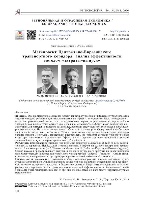 Мегапроект, Центрально-Евразийский транспортный коридор, метод «затраты–выпуск», межотраслевой баланс, модель Леонтьева, макроэкономическая эффективность, мультипликативный эффект, железнодорожная инфраструктура, Северо-Сибирская магистраль, Северный широтный ход