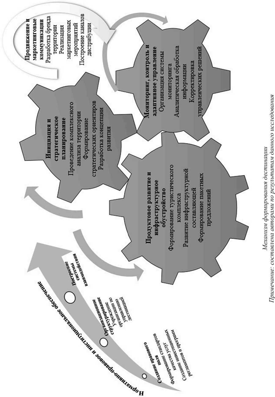 Механизм формирования дестинации является тем практическим конструктом, который интегрирует теоретические установки в единый, циклически организованный управленческий контур, обеспечивающий перевод потенциала территории в конкурентоспособное и устойчивое туристское предложение. Нами предлагается архитектура данного механизма, отражающая взаимодействие его ключевых элементов, представлена на рисунке 1.