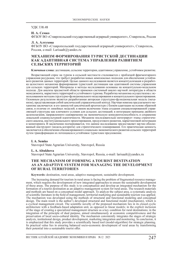 Возрастающий спрос на туризм в сельской местности сталкивается с проблемой фрагментарного управления ресурсами, что требует разработки новых комплексных подходов для обеспечения устойчивого развития данных территорий. Целью данного исследования является концептуализация и разработка целостного механизма формирования туристской дестинации как адаптивной системы управления для сельских территорий. Материалы и методы исследования основаны на концептуально-модельном подходе. Для анализа предметной области применен системный анализ научной литературы в области менеджмента, маркетинга территорий и устойчивого туризма. Разработка механизма осуществлена с использованием методов структурно-функционального моделирования и концептуального проектирования. Основным результатом является разработанная авторская структурно-функциональная модель (механизм), представляющая собой циклический управленческий контур. Научная новизна предлагаемого механизма заключается: в его замкнутой циклической архитектуре с блоком адаптации на основе обратной связи, в отличие от линейных моделей; в явном включении этапа создания специализированной управляющей структуры как ключевого условия для сельских дестинаций; в интеграции принципа двойного целеполагания, направленного одновременно на экономическую конкурентоспособность и сохранение локальной социокультурной идентичности. Механизм последовательно интегрирует этапы стратегического анализа, институционального проектирования, продуктового развития, маркетинговой интеграции и мониторинга. В заключении подчеркивается, что данное исследование предоставляет научно обоснованный инструмент (модель-алгоритм) для стратегического планирования. Его практическая ценность заключается в обеспечении сбалансированного социально-экономического развития сельских территорий путем трансформации их потенциала в устойчивое туристское предложение.