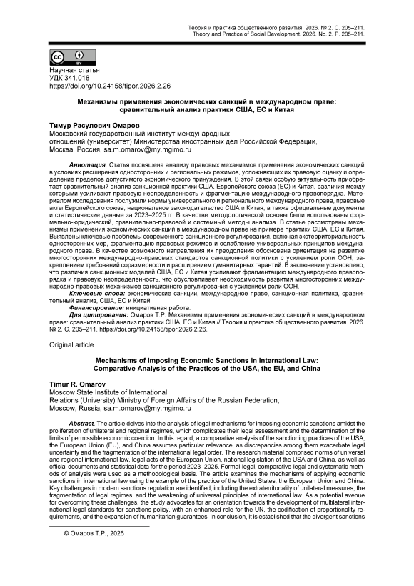 Статья посвящена анализу правовых механизмов применения экономических санкций в условиях расширения односторонних и региональных режимов, усложняющих их правовую оценку и определение пределов допустимого экономического принуждения. В этой связи особую актуальность приобретает сравнительный анализ санкционной практики США, Европейского союза (ЕС) и Китая, различия между которыми усиливают правовую неопределенность и фрагментацию международного правопорядка. Материалом исследования послужили нормы универсального и регионального международного права, правовые акты Европейского союза, национальное законодательство США и Китая, а также официальные документы и статистические данные за 2023–2025 гг. В качестве методологической основы были использованы формально-юридический, сравнительно-правовой и системный методы анализа. В статье рассмотрены механизмы применения экономических санкций в международном праве на примере практики США, ЕС и Китая. Выявлены ключевые проблемы современного санкционного регулирования, включая экстерриториальность односторонних мер, фрагментацию правовых режимов и ослабление универсальных принципов международного права. В качестве возможного направления их преодоления обоснована ориентация на развитие многосторонних международно-правовых стандартов санкционной политики с усилением роли ООН, закреплением требований соразмерности и расширением гуманитарных гарантий. В заключение установлено, что различия санкционных моделей США, ЕС и Китая усиливают фрагментацию международного правопорядка и правовую неопределенность, что обусловливает необходимость развития многосторонних международно-правовых механизмов санкционного регулирования с усилением роли ООН.