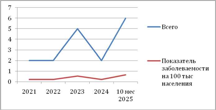 Результаты. Мониторинг инцидентности ГФМИ в Республике Бурятия (данные Управления Роспотребнадзора по РБ) выявил стабильно низкий уровень заболеваемости в 2021–2022 гг.: 0,21 случая на 100 тыс. населения ежегодно. Эпидемиологический перелом зафиксирован в 2023 г. — показатель возрос до 0,53/100 тыс. (рост в 2,5 раза). После временной стабилизации в 2024 г. (0,21/100 тыс.) к октябрю 2025 г. инцидентность достигла максимальных за анализируемый период значений — 0,65/100 тыс., что в 3,1 раза превышает базовый уровень (табл. 1).