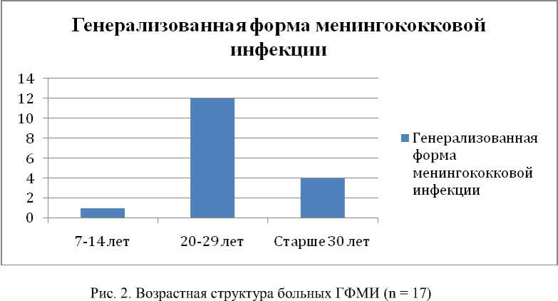 Представлены результаты проспективного анализа эпидемиологических и клинико-лабораторных параметров 17 пациентов с генерализованной формой менингококковой инфекции (ГФМИ), получавших терапевтическую помощь в ГБУЗ «Республиканская клиническая инфекционная больница» на протяжении периода заболеваемости менингококковой инфекцией в г. Улан-Удэ в 2021–2024 гг. и 10 месяцев 2025 г. Возрастной диапазон обследованных больных составил от 1–17 до 60 лет.