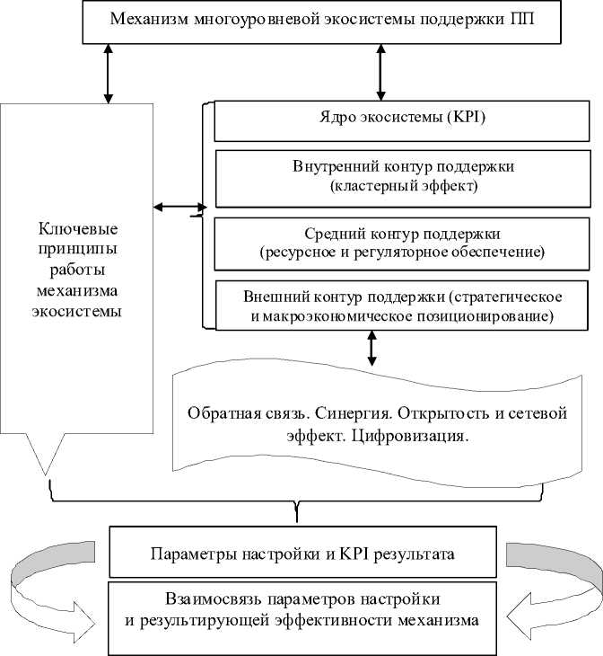 В исследовании проведена оценка многоуровневой экосистемы поддержки ПП. Автором разработаны ключевые параметры и метрики. Выстроена взаимосвязь параметров настройки и результирующей эффективности механизма поддержки ПП. Многоуровневая экосистема поддержки представляет собой переход от качественной модели к количественным показателям эффективности. Ключевыми параметрами механизма многоуровневой экосистемы поддержки ПП: параметры координации и управления, параметры ресурсного обеспечения, параметры развития связей. Управление механизмом поддержки заключается в постоянном мониторинге параметров, измерении эффективности и корректировке настроек для достижения максимальной синергии между всеми уровнями экосистемы.