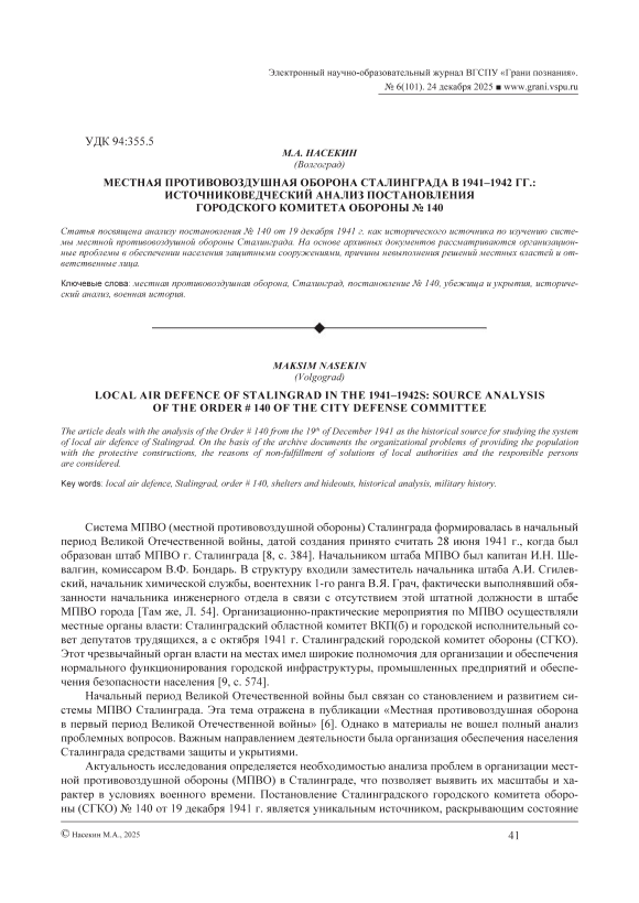 Актуальность исследования определяется необходимостью анализа проблем в организации местной противовоздушной обороны (МПВО) в Сталинграде, что позволяет выявить их масштабы и характер в условиях военного времени. Постановление Сталинградского городского комитета обороны (СГКО) № 140 от 19 декабря 1941 г. является уникальным источником, раскрывающим состояние подготовки МПВО Сталинграда накануне битвы. Анализ проблем в организации безопасности населения, промышленных объектов и инфраструктуры в таком стратегически важном городе Юга страны очень важен для их понимания.
