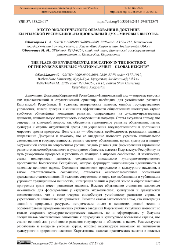 Доктрина Кыргызской Республики «Национальный дух — мировые высоты» как идеологический и стратегический ориентир, необходим для устойчивого развития Кыргызской Республики. В условиях исторических вызовов, ошибок государственного управления, потери доверия и снижения эффективности общественных институтов стране требуется обновлённая концепция развития, опирающаяся на духовно-нравственные ценности, национальную идентичность и современные подходы. Статья актуальна потому, что отвечает на ключевой вопрос: как обеспечить гармоничное развитие образования, науки, культуры и охраны окружающей среды для укрепления государственности и достижения мирового уровня прогресса. Цель статьи — обосновать необходимость реализации главных направлений Доктрины и показать, что её внедрение позволит: укрепить национальное самосознание и государственность; развить систему образования, науки, культуры и защиту окружающей среды на современном уровне; создать условия для формирования гармонично развитого, высокообразованного и культурного общества; вывести Кыргызскую Республику на путь ускоренного прогресса и укрепить её позицию в мировом сообществе. В заключение, статья подчеркивает важность сохранения уникального культурно-исторического пространства Кыргызской Республики, которое формирует национальную идентичность и духовные ценности народа. Осознание значимости природного и культурного наследия, а также ответственность сохранение, становятся основополагающими элементами гражданского самосознания. В условиях современного мира, где глобализация и урбанизация угрожают традиционным ценностям, интеграция знаний о родной земле в образовательные программы вузов имеет решающее значение. Высшее образование становится ключевым механизмом для формирования у студентов экологической, культурной и гражданской компетентности, что в свою очередь способствует устойчивому развитию страны и укреплению её национальных ценностей. Гипотеза статьи заключается в том, что интеграция знаний о природных ресурсах, историческом опыте и ценностях родной земли в образовательные программы высших учебных заведений Кыргызской Республики позволит не только сохранить культурно-историческое наследие, но и сформировать у будущих специалистов ответственное отношение к природным и культурным богатствам страны, что станет основой для устойчивого развития государства и общества в целом. Рекомендуется разработать и внедрить учебные курсы, которые акцентируют внимание на значимости культурного и природного наследия Кыргызстана, включая практические занятия и полевые исследования. Необходимо установить партнерские отношения между вузами и местными сообществами для совместной работы по сохранению природных и культурных ресурсов, что позволит студентам получить практический опыт и углубить свои знания. Рекомендуется активизировать научные исследования в области экологии, культурной антропологии и истории, что позволит глубже понять и сохранить уникальные аспекты кыргызской идентичности.