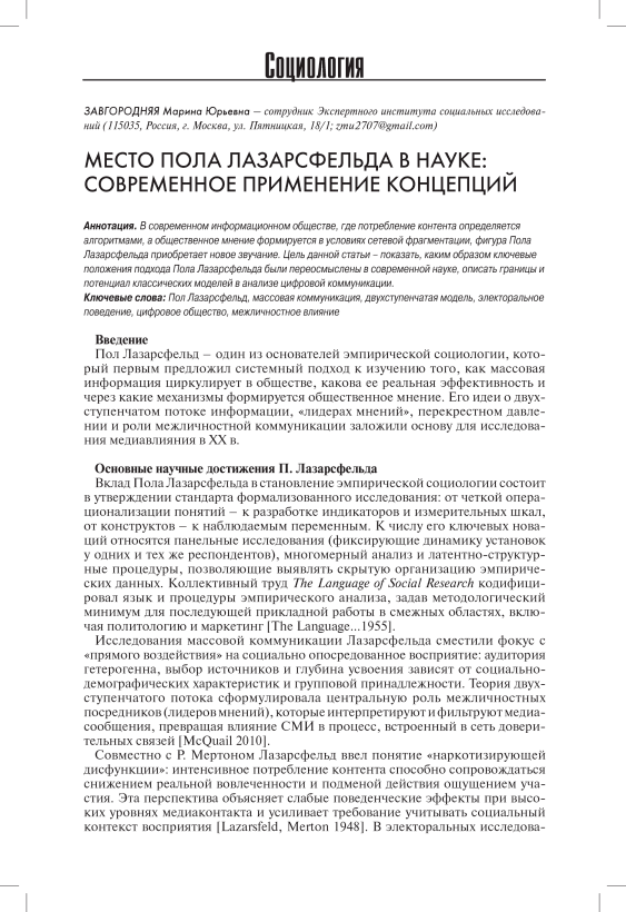 В современном информационном обществе, где потребление контента определяется алгоритмами, а общественное мнение формируется в условиях сетевой фрагментации, фигура Пола Лазарсфельда приобретает новое звучание. Цель данной статьи – показать, каким образом ключевые положения подхода Пола Лазарсфельда были переосмыслены в современной науке, описать границы и потенциал классических моделей в анализе цифровой коммуникации.