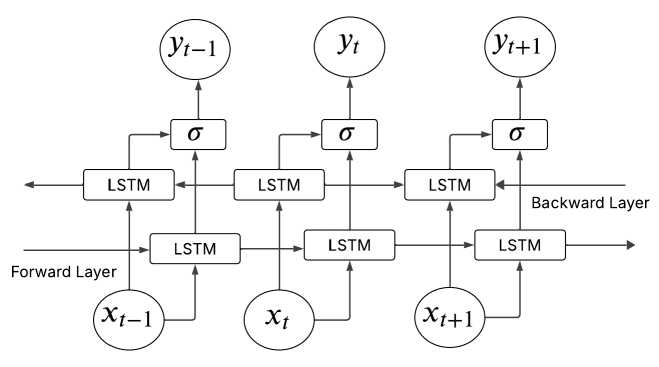 A Bidirectional LSTM (BiLSTM) works by simultaneously processing streams of data in both forward and backward directions. At each time step, forward and backward LSTM networks are fed the input state to capture both future and past context. This two-way approach enables students to learn more effectively and efficiently. Xt - 1 , Xt , and Xt + 1 are the previous, present, and future inputs, respectively. Yt - 1 , Yt , and Yt + 1 are the previous, present, and future outputs, respectively. The BiLSTM architecture is shown in Figure 1.