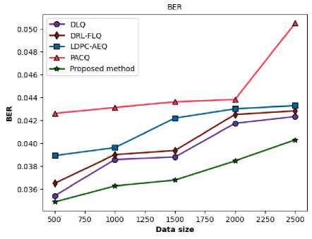 Table 5 presents the runtime computation for a data size of 2500 symbols (in seconds). The proposed method consistently has the lowest run time in all three channel conditions, making it the most computationally efficient of the group (2.34s, 3.21s, and 2.18s). The methods rank from slowest to fastest: DLQ, followed by DRL-FLQ, then LDPC-AEQ, PACQ, and finally the proposed method. For all methods, the computation time is fastest in the AWGN channel and slowest in the Rayleigh channel.