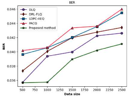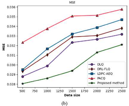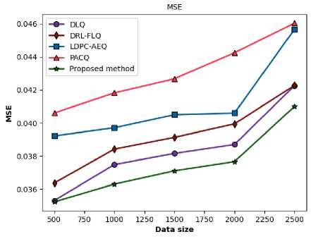 Consistent with the BER results, the proposed method achieves the lowest MSE across all data sizes, indicating superior fidelity in signal estimation. A lower MSE suggests that the receiver is more effective at mitigating the effects of noise, delivering a higher-fidelity representation of the transmitted signal. This superior capability in combating noise is fundamental to its overall performance. For example, at a data size of 2500 symbols, the proposed method's MSE of 0.041003 is 3.0% lower than DLQ's and 10.9% lower than PACQ's, demonstrating its sustained advantage in estimation accuracy.
