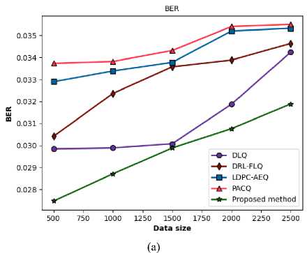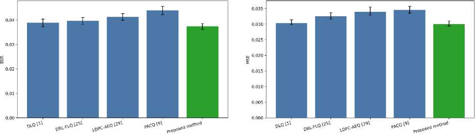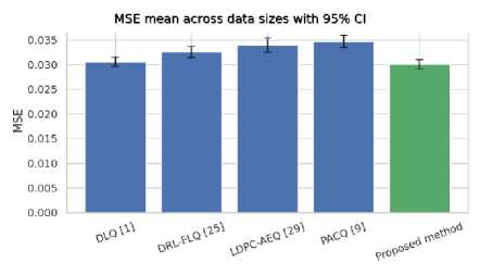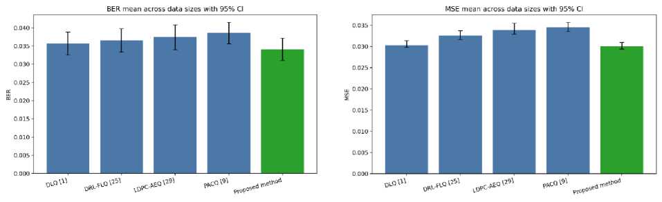 BER and MSE mean values across data sizes, with 95% confidence interval (CI) error bars, over a Rayleigh fading channel, are shown in Figs. 8(a) and 8(b). In Fig. 8(a), the proposed method has the lowest mean BER of 0.0374 with 95% CI (0.03615 (lower) to 0.03865 (upper)). The proposed method has a closer CI overlap with DLQ [1] and DRL-FLQ [25], but it does not have CI overlap with LDPC-AEQ [29] and PACQ [9]. In Fig. 8(b), the proposed method has the lowest mean MSE of 0.03 with 95% CI (0.0294 (lower) to 0.031(upper) ) compared to competing methods, DRL-FLQ [25], LDPC-AEQ [29], and PACQ [9] at the 95% CI level. The proposed method has a close CI overlap with DLQ [1].