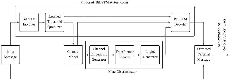 The proposed method integrates meta-learning with a BiLSTM-based autoencoder to achieve robust error correction across diverse channel conditions. This method consists of three components: a bidirectional LSTM encoder-decoder, a learnable one-bit quantizer with adaptive thresholds, and a channel-aware meta-discriminator. These components optimize both quantization efficiency and error correction performance while retaining adaptability to varying channel characteristics.