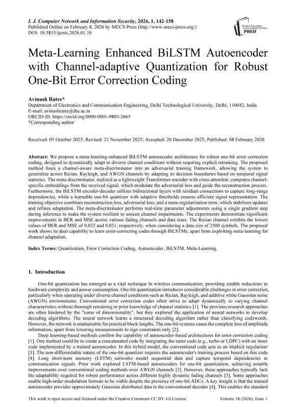 Текст научной статьи Meta-Learning Enhanced BiLSTM Autoencoder with Channel-adaptive Quantization for Robust One-Bit Error Correction Coding