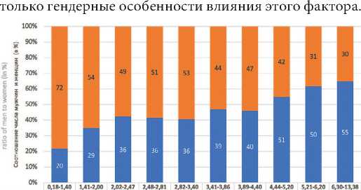 Процентное распределение мочекислых камней между мужчинами и женщинами не имело заметных различий при нарастании магнийурии, за исключением диапазона экскреции магния ниже 1,41 мМ/сут, в котором доля мочекислых камней у мужчин более, чем в 2,5 раза превышала их долю у женщин (рис. 2, χ2 тест, р =0,023).